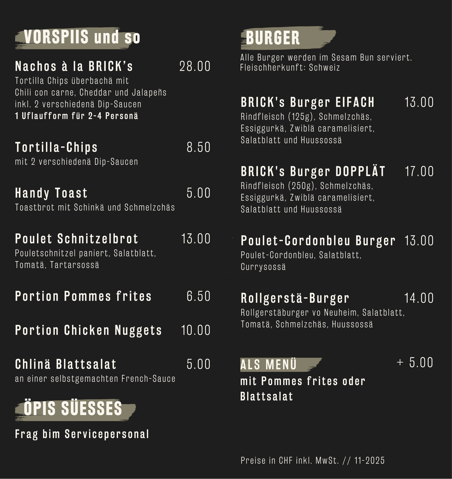 Auch für den kleinen oder grösseren Hunger gibt's bei uns etwas. Probier doch unseren selbstgemachten BRICK's Burger mit knusprigen Pommes frites.